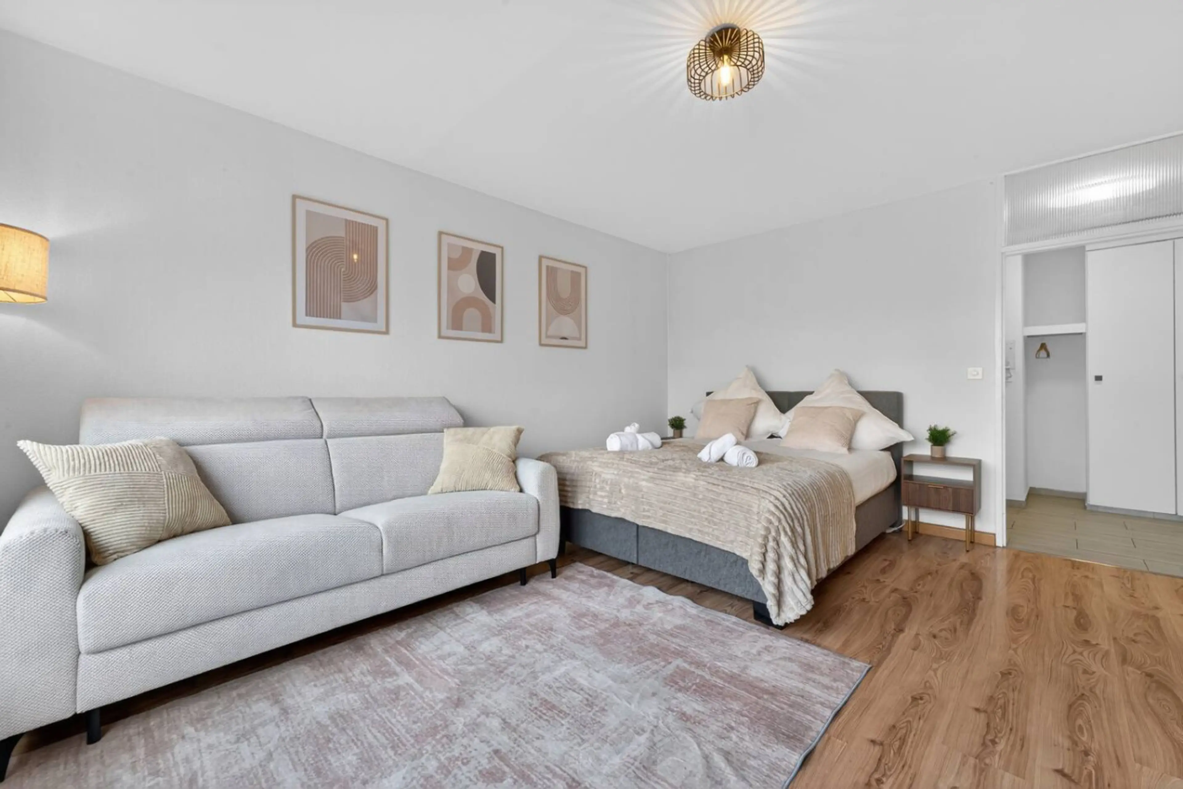 Bright, modern 1.5-room apartment with balcony in Basel – ideal for city trips & business stays (up to 4 guests incl. sofa bed). Quiet, clean and fully equipped for short or longer stays. • 55" Smart TV + Netflix • Fast Wi-Fi + height-adjustable desk & monitor • Kitchen: hob, microwave, fridge, cof...
